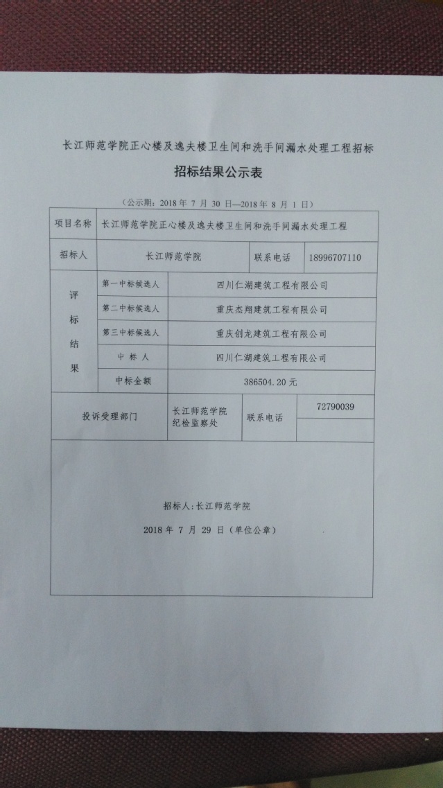长江师范学院关于正心楼及逸夫楼卫生间和洗手间漏水处理工程招标结果公示