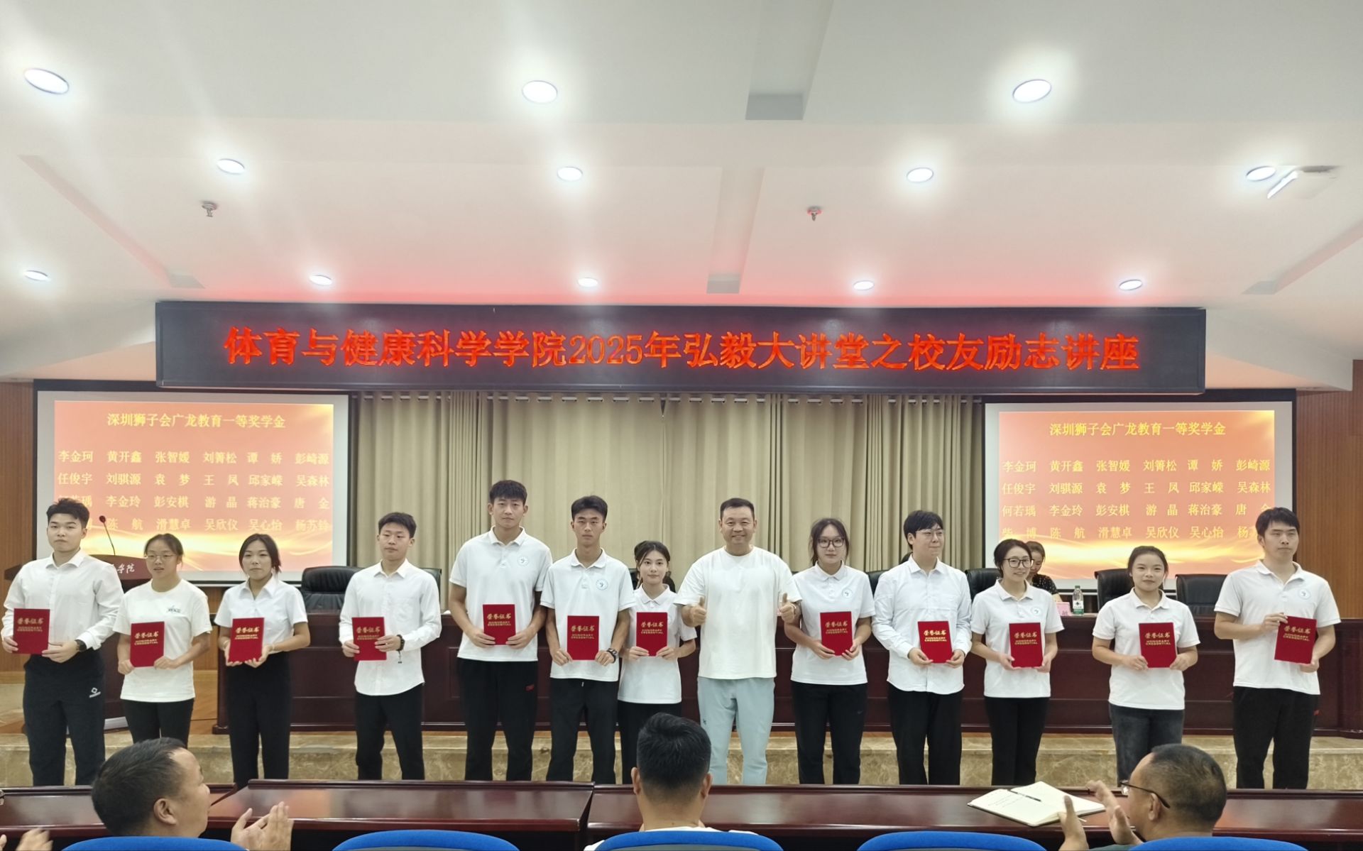 10月10日,我校1995级体育系优秀校友庞坤回访母校,在鉴湖学术报告厅为学弟学妹颁发2025年深圳狮子会广龙教育奖学金并开展励志讲座。