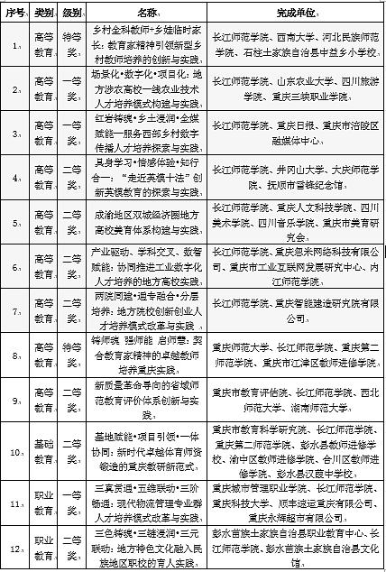 近日,重庆市人民政府公布了2025年重庆市教学成果奖获奖项目名单。我校共获得高等教育、基础教育、职业教育12项教学成果奖,获奖数量创历史新高。其中,学校作为第一完成单位共获得高等教育(本科)教学成果奖7项,包括特等奖1项、一等奖2项、二等奖4项,获奖数量在重庆市属高校中并列第一。此外,学校与校外单位合作,参与获得2项高等教育(本科)教学成果奖(特等奖、二等奖各1项),2项职业教育教学成果奖(一等奖、二等奖各1项),1项基础教育教学成果二等奖。