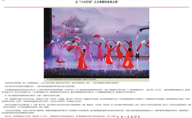 自承接教师教育创新机制改革试点任务以来,长江师范学院始终坚持高位统筹部署、全员同向发力,出台《教师教育高质量发展实施方案》,聚焦“教师教育办学能力优质”与“服务基础教育优秀”,重点实施“八大行动”,即教育家精神铸魂强师行动、教师教育学科振兴行动、师范专业内涵提升行动、人才培养质量提升行动、教师教育师资队伍优化行动、服务引领基础教育优质均衡行动、人工智能赋能教师教育行动、教师教育办学条件改善行动。