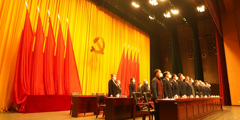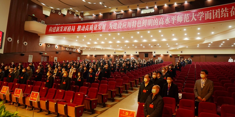 拏云学生活动中心气氛隆重热烈,中国共产党党徽悬挂在主席台正中熠熠生辉,两侧10面鲜艳的红旗交相辉映。会场主席台对面悬挂着“构建新发展格局,推动高质量发展,为建设应用特色鲜明的高水平师范大学而团结奋斗”的标语。