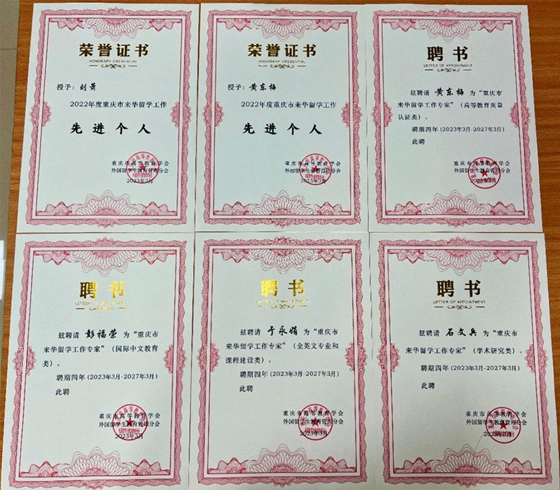 日前,重庆市高等教育学会外国留学生教育管理分会第二届理事会2023年第一次会员大会顺利举行,会议对重庆市2022年度来华留学生先进集体与先进个人进行了表彰。我校国际学院教师黄东梅、刘萧被评为“来华留学工作先进个人”,教师黄东梅、石文兵、彭福荣、于永娟被聘为重庆市来华留学工作专家。