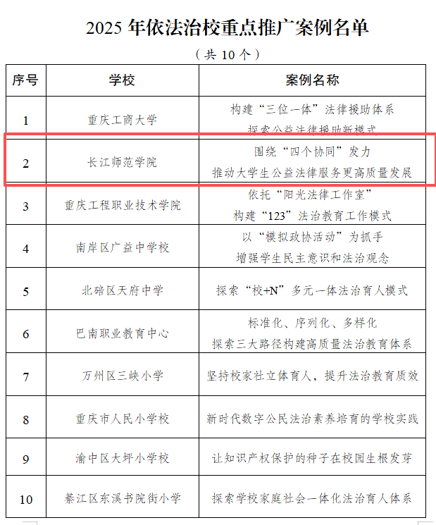 近日,重庆市教育委员会发布《关于公布2025年依法治校特色案例的通知》,我校报送的《围绕“四个协同”发力推动大学生公益法律服务更高质量发展》案例,成功入选市级“依法治校重点推广典型案例”。此次评选全市仅遴选10项重点推广案例,其中普通本科高校仅2所。