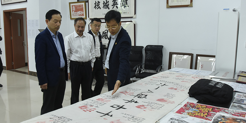 在南苑八舍学生社区,陈光海观看了我校学子的书画作品,走访察看了新型学生社区的建设发展情况,并与在场师生亲切交流。