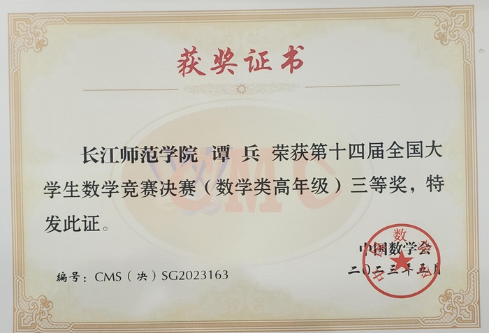 5月28日,第十四届全国大学生数学竞赛全国总决赛在广东工业大学圆满落幕,我校数学与统计学院学生谭兵荣获数学专业(高年级组)全国三等奖。
