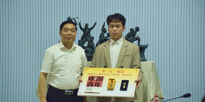 美术学院毕业生张诚代表2023届全体毕业生向母校赠送了一座雕塑作品《夺取胜利》,表达了同学们始终不忘初心,勇毅前行的昂扬斗志和对母校申硕攻坚战夺取胜利,建成应用特色鲜明的高水平师范大学的美好祝愿。向小川副校长为毕业生代表赠送了学校精心准备的纪念品“一书一石一如意”,期盼同学们始终怀抱梦想、脚踏实地、敢想敢为、善作善成,以坚如磐石的信心、只争朝夕的劲头、坚韧不拔的毅力,争当新时代的践行者、奋斗者和追梦人。