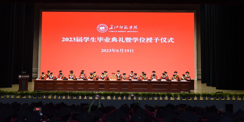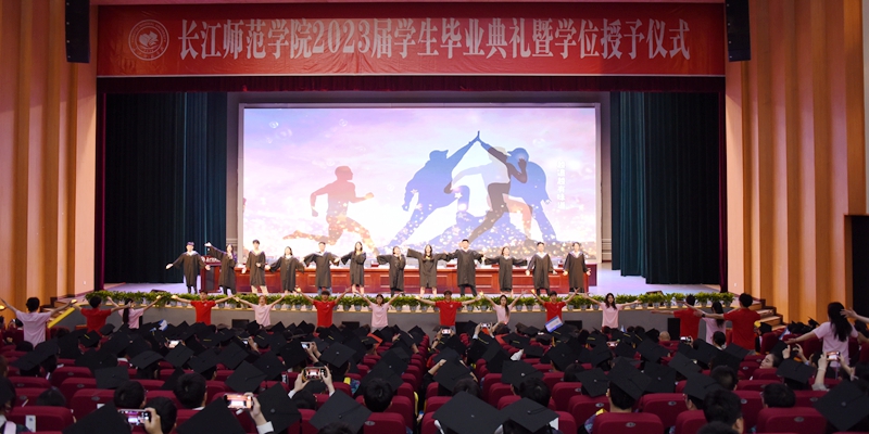 拏云学生活动中心庄重热烈,舞台正中悬挂着横幅“长江师范学院2023届学生毕业典礼暨学位授予仪式”。精心制作的毕业视频《致即将毕业的你》,让同学们重温了大学四年里一个个难忘的瞬间,带着梦想、勇气、祝福与思考开启人生新阶段。暖场歌曲《我们都是追梦人》《星辰大海》《那些年》唱响,毕业生们的歌声中满是不舍与留恋、感恩与祝福。