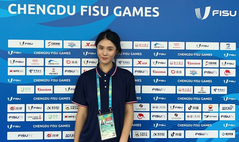 在举世瞩目的第31届世界大学生夏季运动会中,无数志愿者、赛事工作人员们为大运盛会奉献着青春力量。我校传媒学院2022级播音与主持艺术专业学生谭理月担任了中文播报员,负责赛前播报、颁奖仪式播报两个板块,用声音传递信息,用声音感染观众,光荣地完成了各项工作。