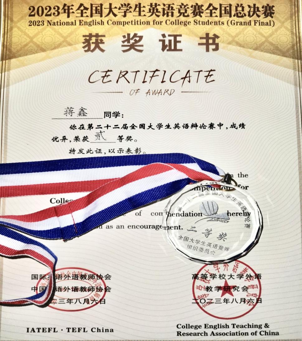 日前,2023年全国大学生英语竞赛(NECCS)全国总决赛落下帷幕, 我校外国语学院学子蒋鑫荣获全国总决赛二等奖。