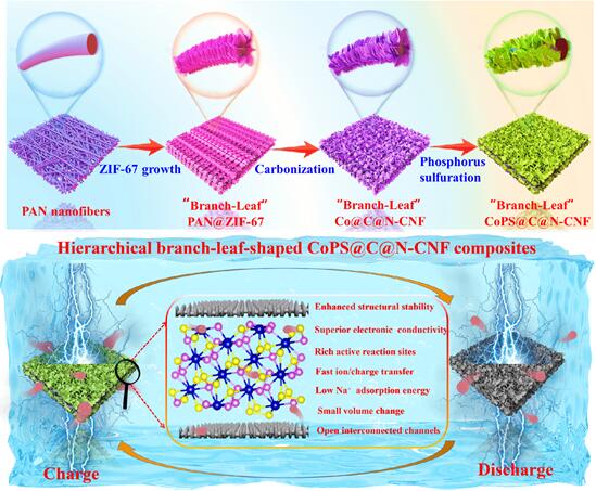 赵文喜团队受自然界中枝叶光合作用的启发,制备合成的分级枝叶状CoPS@C@N-CNF结构展现出了优异的电化学性能,有效解决了过渡金属磷硫化物负极材料中长期存在的体积膨胀大、钠离子扩散动力学迟缓和循环寿命差的问题。