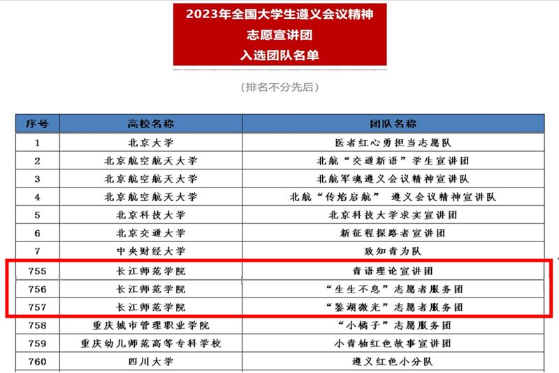 10月13日,由团中央青年志愿者行动指导中心、中共遵义市委、共青团贵州省委联合开展的2023年全国大学生遵义会议精神志愿宣讲活动公布入选团队名单,来自全国540所高校的1000支团队入选。我校政治与历史学院青语理论宣讲团、现代农业与生物工程学院“生生不息”志愿者服务团队、机器人工程学院“鉴湖微光”志愿者服务团成功入选。