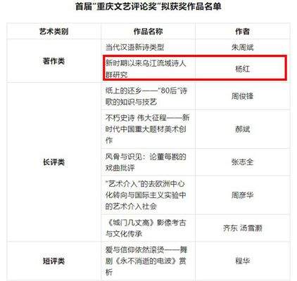 近日,首届“重庆文艺评论奖”评选结果公示,我校教师教育学院杨红博士的专著《新时期以来乌江流域诗人群研究》获奖。