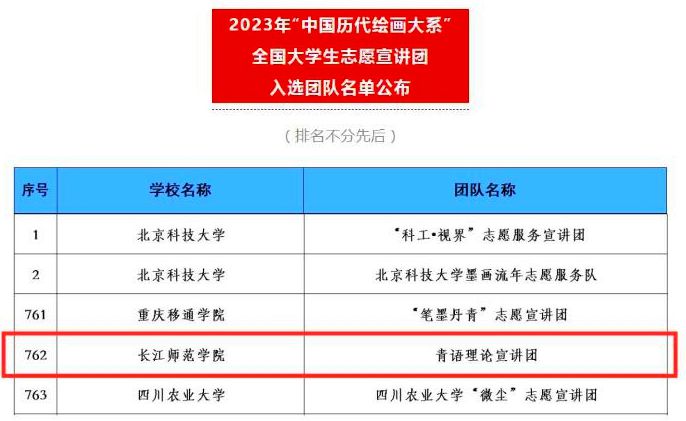 11月27日,由团中央青年志愿者行动指导中心、教育部中外语言交流合作中心、中国外文局文化传播中心、中国文物报、浙江大学联合开展的2023年“中国历代绘画大系”全国大学生志愿宣讲活动公布了入选团队名单,我校政治与历史学院青语理论宣讲团成功入选。