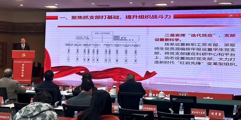 11月27日至28日,重庆市首届高校二级院系党组织书记讲党建比赛在重庆师范大学举办,来自全市高校的70名院系党组织书记参赛。经过激烈角逐,我校机器人工程学院党委书记、院长黄江波同志荣获大赛一等奖。