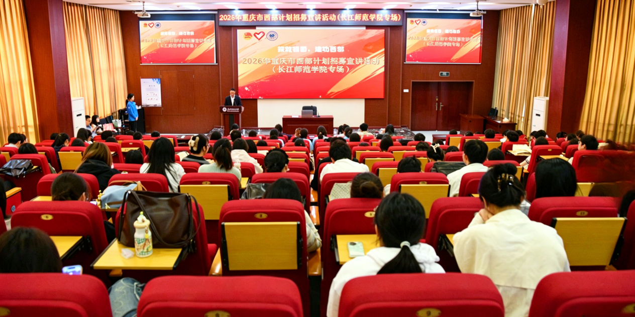 4月24日,2026年重庆市西部计划招募宣讲专场活动在我校摇光学术报告厅举行。市项目办、涪陵区、武隆区、垫江县、石柱县西部计划项目办有关负责同志,优秀志愿者代表及2022级应届毕业生代表参加活动。