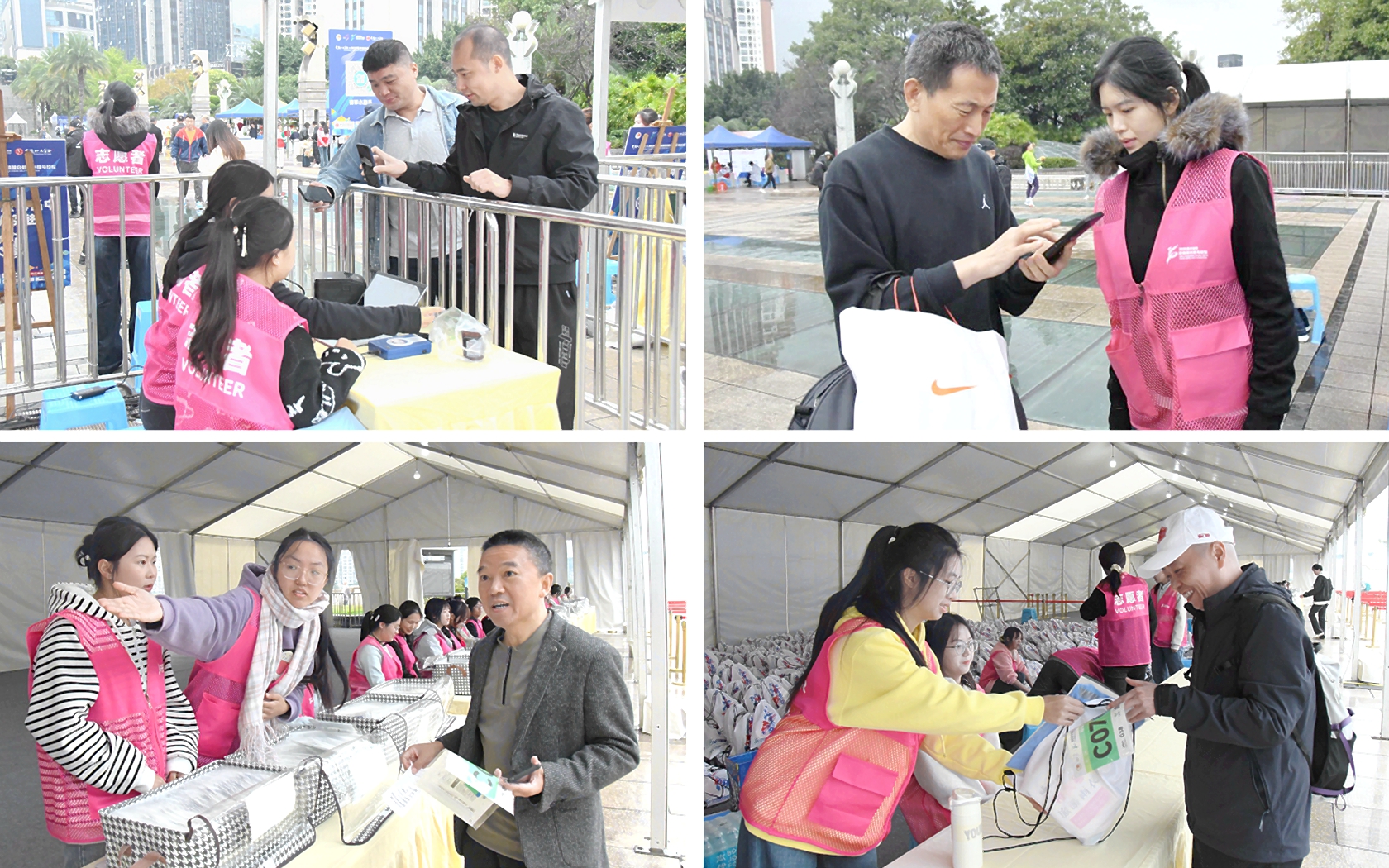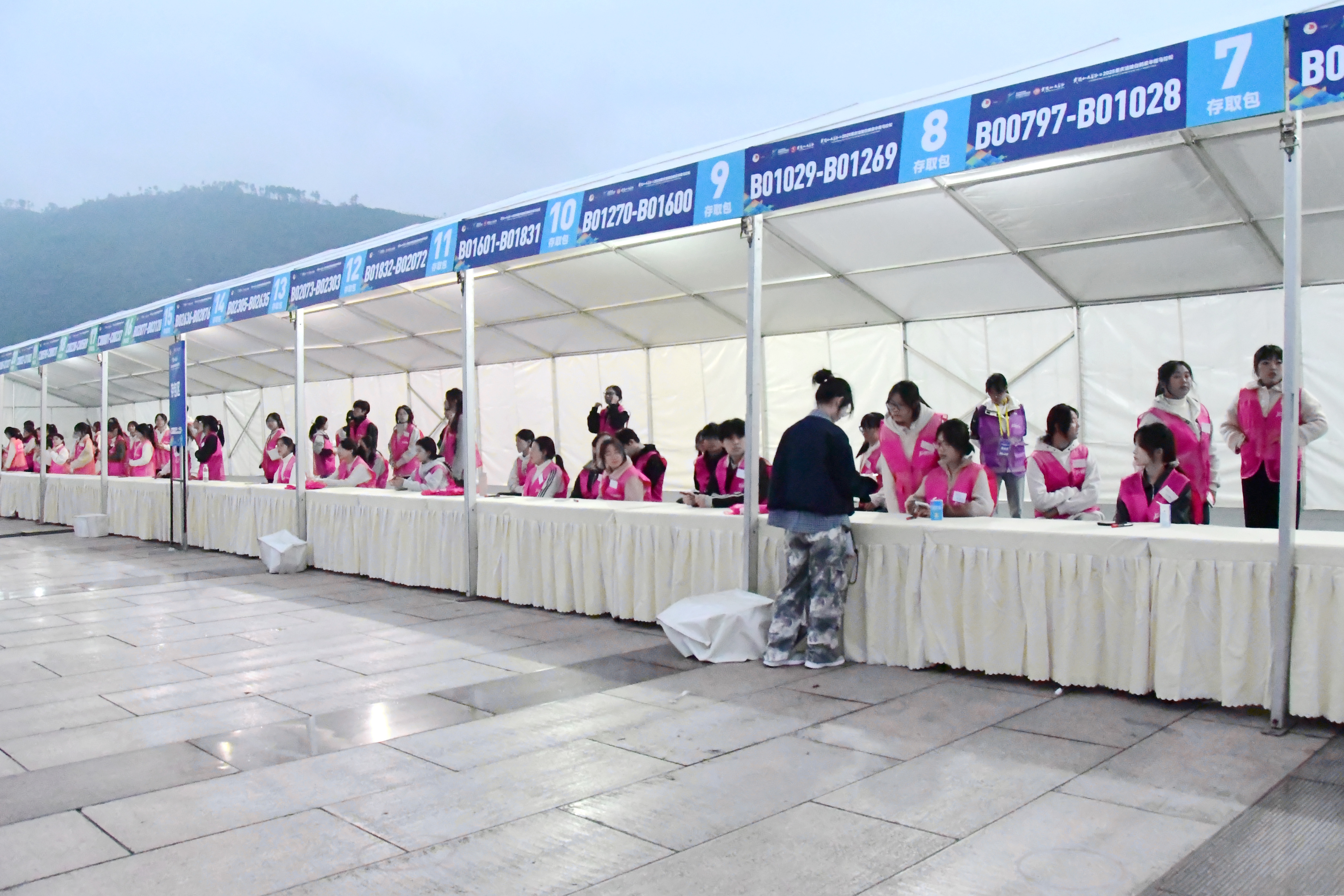 赛事准备阶段,志愿者们在锦绣广场主会场核对信息、发放物资,精神饱满、服务专业。