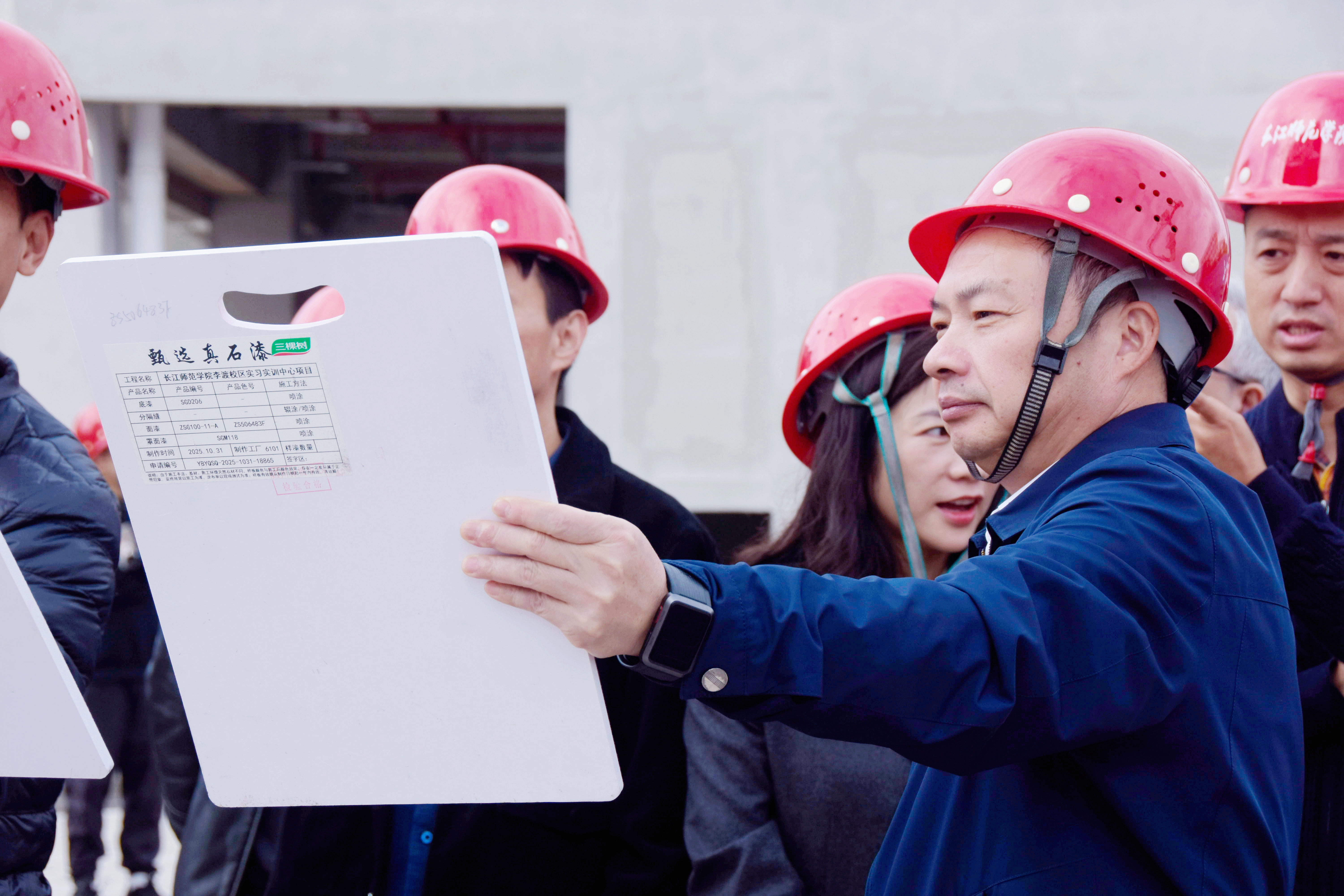 黄大勇一行沿项目外围区域仔细查验,现场听取相关部门工作汇报,关切询问墙体材料性能等细节,重点就外立面设计等具体细节提出指导意见,要求在突出项目功能定位的同时与校园整体风貌相协调一致。