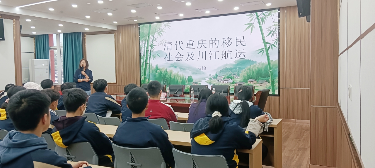 石怡以《清代重庆的移民社会和川江航运》为题,围绕“湖广填四川”这一重大移民浪潮展开,以严谨的史学态度和清晰的逻辑脉络,详细阐述了移民迁入对重庆人口结构、文化融合、生产方式带来的深远变革。同时,她聚焦川江航运的发展历程,从船舶形制演变到码头商业繁荣,从货物运输种类到航运带动的城镇兴起,全面展现了川江航运对重庆发展的关键作用,引导同学们结合历史变迁思考个人与时代的关系,鼓励大家从历史中汲取智慧,树立远大理想,引发了在场学生的强烈共鸣。