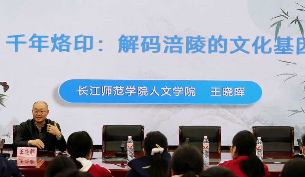 王晓晖以《千年烙印:解码涪陵的文化基因》为题,系统剖析了支撑涪陵文化的三大核心基石,从乌江与长江交汇形成的水文水事千年记录切入,结合涪陵历代水利建设、航运发展等史实,梳理了水文化对涪陵发展的深远影响。同时,他以涪陵榨菜、特色民俗等为例,讲述了饮食文化背后承载的百年生活记忆,落脚到涪陵人坚韧务实、开放包容的独特性格基因,让中学生对家乡文化有了更加深刻的认知。