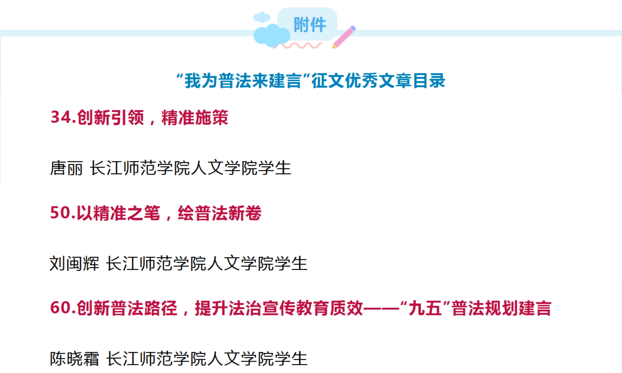 近日,由司法部普法与依法治理局、中国法治杂志社联合开展的“我为普法来建言”征文活动公布了评选结果,人文学院学生提交的3篇征文获评优秀文章。