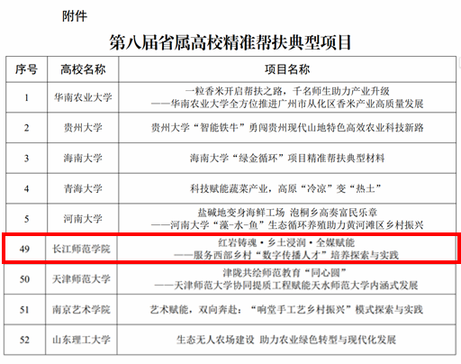 近日,教育部发展规划司公布第八届省属高校精准帮扶典型项目评选结果,共推选出了66个项目。我校培育推荐的乡村振兴帮扶项目《红岩铸魂·乡土浸润·全媒赋能——服务西部乡村“数字传播人才”培养探索与实践》在激烈竞争中脱颖而出,成为重庆市唯一入选的本科高校项目。