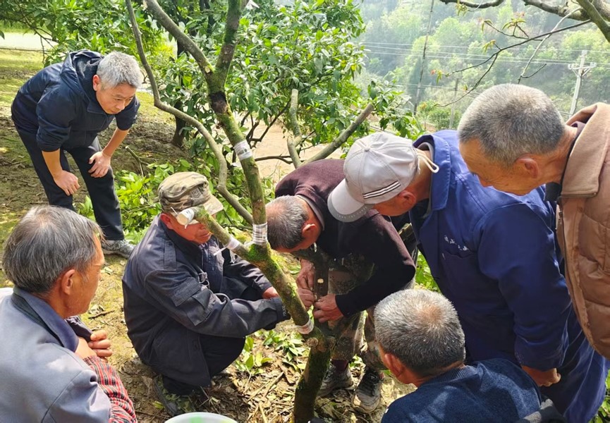 白天富选择了园子中间的一棵果树进行修剪,并再次演示了修枝要点。此时,修剪后的梨橙枝干,清爽、挺立,十分精神。“大家注意看,我们选择的嫁接点,朝向东南西北不同方向,主要是避免长出枝条相互干扰影响。”这是第一个要点。“刀斜切入皮质层,在木质层之上的形成层中平推进行,要求粘木不伤木。嫁接膜包扎有三个要点,刀口、芽头、芽尾要压一下,不给嫁接膜留空隙,缠绕枝头时,不能有缝隙,总之,嫁接膜要领就是防止雨水侵入,以免产生病变和氧化”。第一棵果树嫁接结束后,白天富要老代来试一试,把今天的修枝与嫁接技术给实操一遍。
