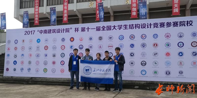 2017年10月18日至22日,第十一届全国大学生结构设计竞赛在武汉大学举行,竞赛题目为“渡槽支承系统结构设计与制作”。我校土木建筑工程学院学生叶兴宇、官义、陈后琼的作品《启辰》,模型主跨设计为张弦梁结构,其余跨径充分利用输水管刚度,柱间不设纵梁,模型最终总质量为203.9g,成功完成承载51.05kg水重加载、持荷和卸载过程,输水损失0.92kg,最终获竞赛全国三等奖。