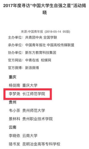 2018年5月14日,由共青团中央、全国学联主办的2017年度寻访“中国大学生自强之星”活动揭晓,我校管理学院2015级市场营销1班学生李梦尧被评选为2017年度“中国大学生自强之星”,全市仅2名学生获此殊荣。