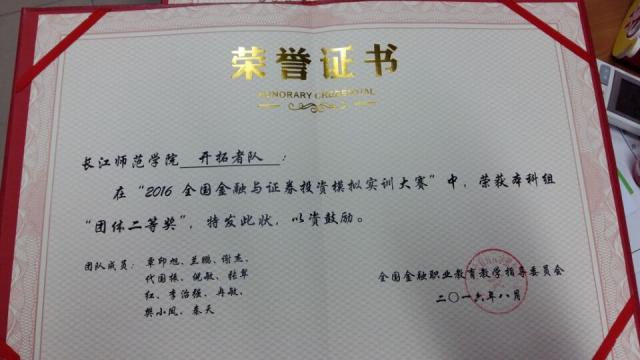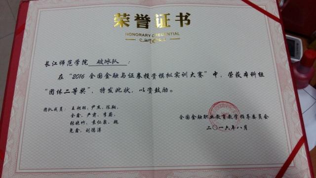 2016年8月,在“2016全国金融与证券投资模拟实训大赛”中,财经学子覃印旭、兰鹏、谢杰、代国振等组成的“开拓者队”和王昶羽、尹杰、陈翔、刘德涛等组成的“破冰队”均荣获本科组团体二等奖,倪敏同学荣获本科组个人二等奖。