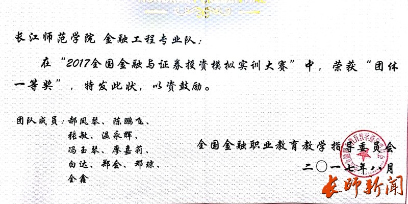 2017年6月,2017年全国金融与证券投资模拟实训大赛圆满落幕。财经学院由郝凤琴、陈鹏飞等10名学生组成的4支参赛队伍,在全国的846支队伍中脱颖而出,荣获全国团体一等奖,金融工程专业全鑫、冯玉琴、罗琪林等共8名参赛同学分别荣获全国个人二等奖、三等奖。