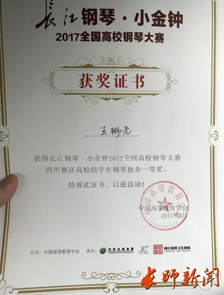 2017年7月,由中国高等教育学会主办的“长江·小金钟”2017全国钢琴大赛四川赛区决赛在四川成都举行,我校音乐学院学生王彬先获高校学生组钢琴独奏一等奖,何海洋、刘忠奇获得三等奖。