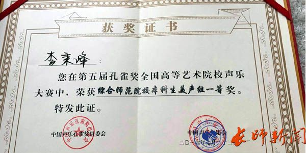 2016年7月,“第五届孔雀奖全国高等艺术院校声乐大赛”在华南师范大学圆满落幕。经过激烈角逐,我校音乐学院大三学生李秉峰在周永红老师的指导下,一路过关斩将,最后荣获综合院校本科美声组一等奖,周永红老师被评为优秀指导教师。