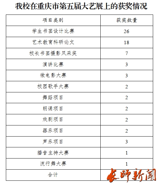 2018年4月,重庆市第五届大学生艺术展演活动圆满结束。我校获得一等奖13项、二等奖21项、三等奖31项及校长风采奖7项,共计72项,获奖总数居全市高校第一。