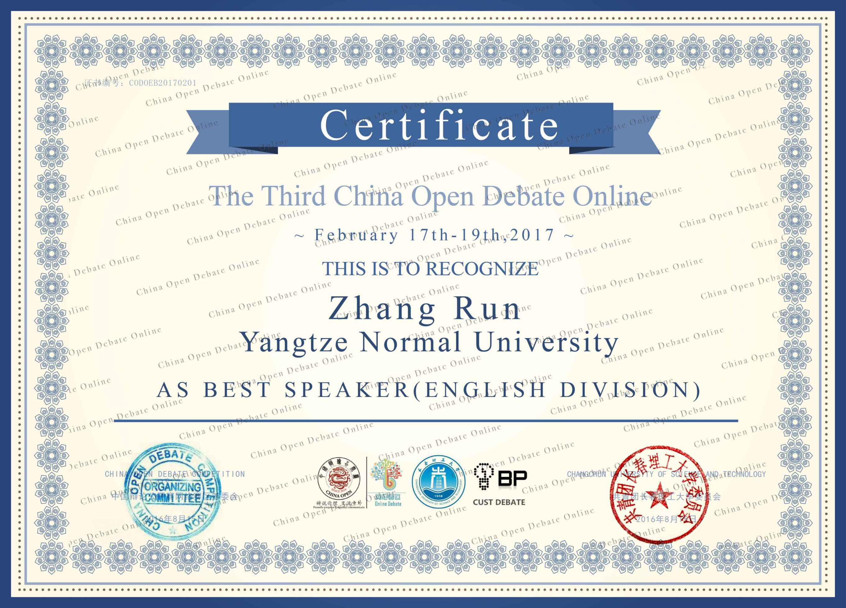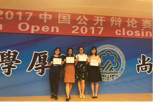 2017年6月,在中国辩论公开赛(CHINA OPEN)英语组比赛中,外国语学院学子张润凭借扎实的外语水平、清晰的论辩获得“最佳辩手”称号。