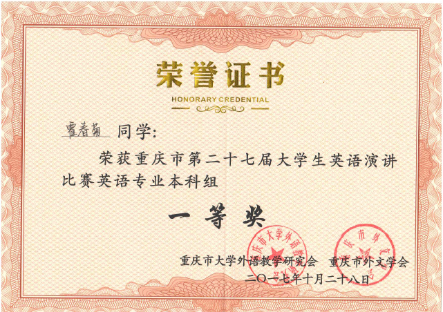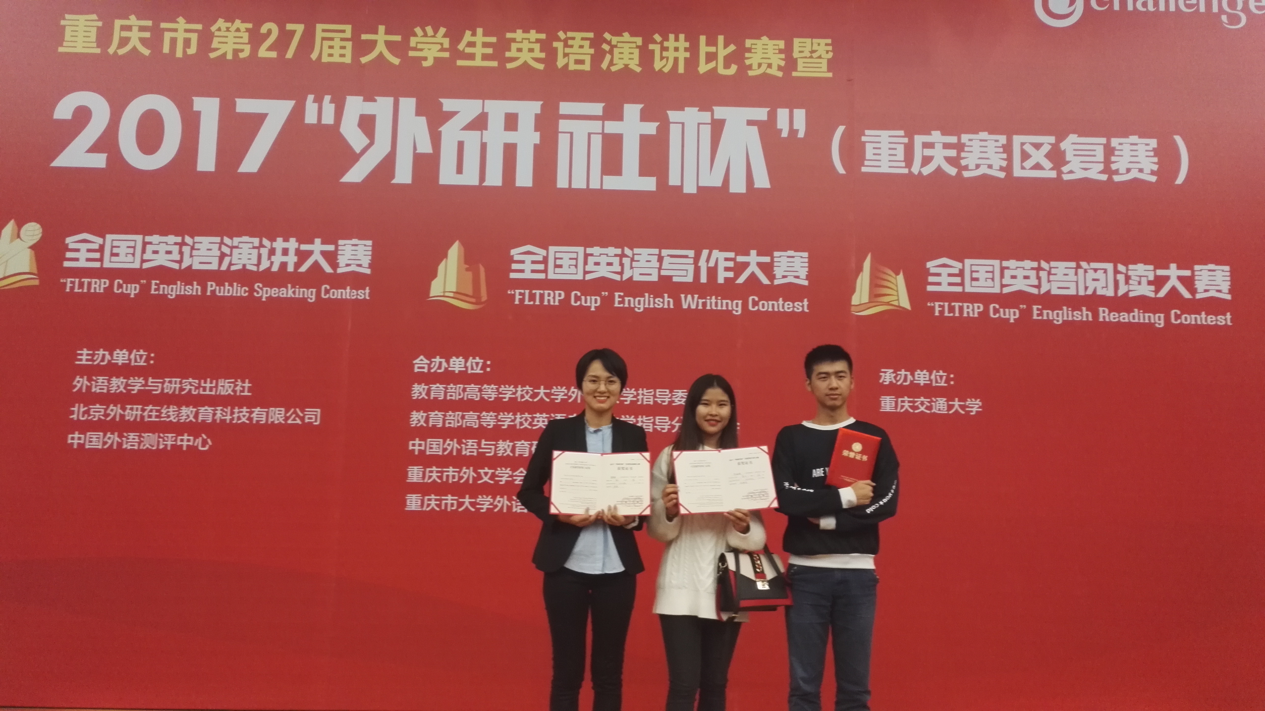 2017年10月,重庆市第27届大学生英语演讲比赛暨2017“外研社杯”英语演讲、写作、阅读比赛中,我校学子获得了两个一等奖、五个三等奖的好成绩。外国语学院2015级英语(非师范)专业学生霍春菊,凭借扎实的专业知识、娴熟的演讲技巧从众多选手中脱颖而出,获得重庆市第27届大学生英语演讲比赛一等奖,成功晋级“外研社杯”大学生英语演讲比赛,并再次凭借出色表现取得一等奖。