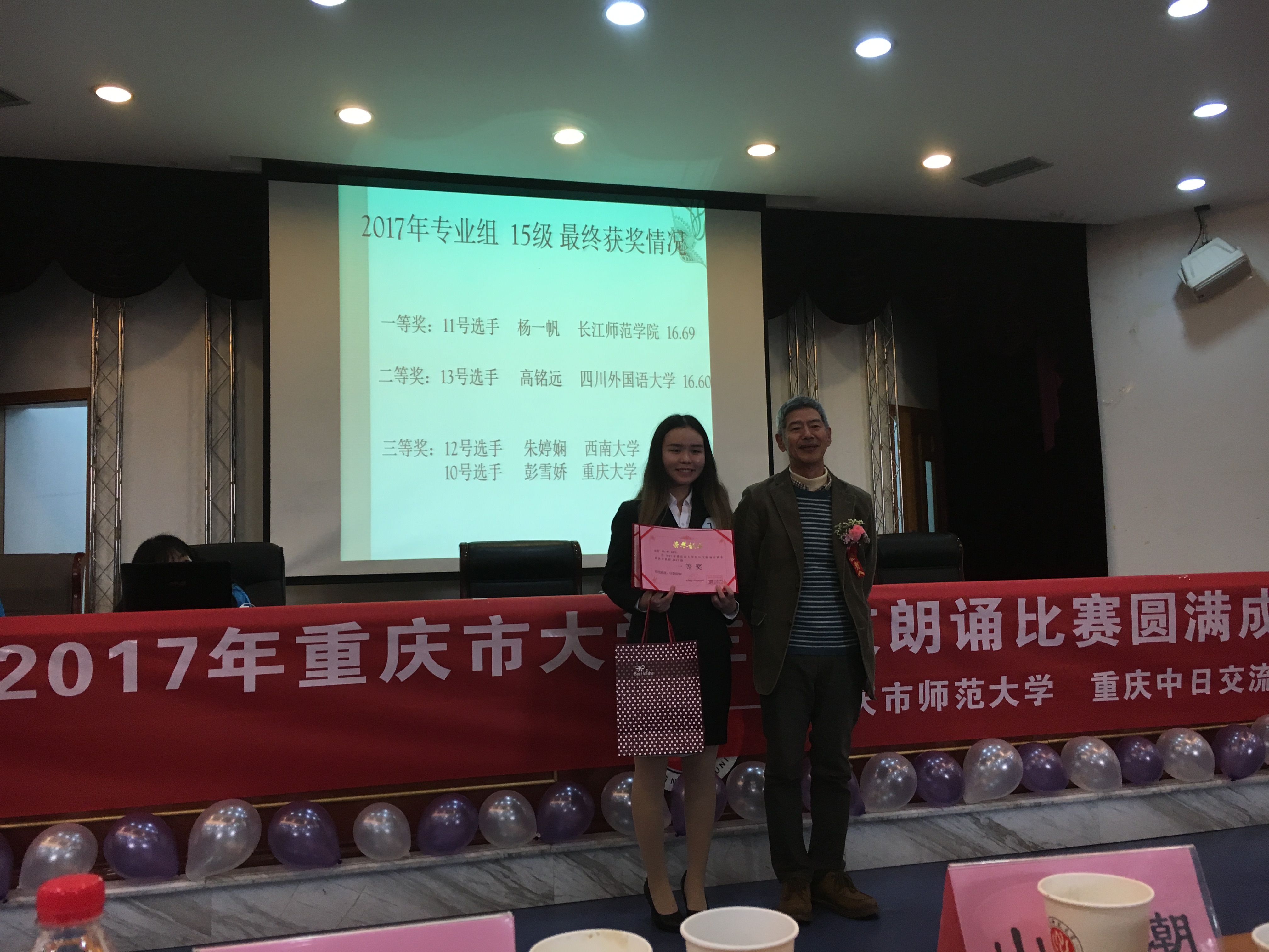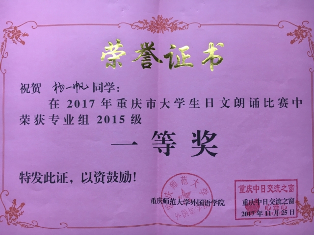 2017年11月,外国语学院学子杨一帆获得重庆市大学生日语朗诵比赛一等奖。