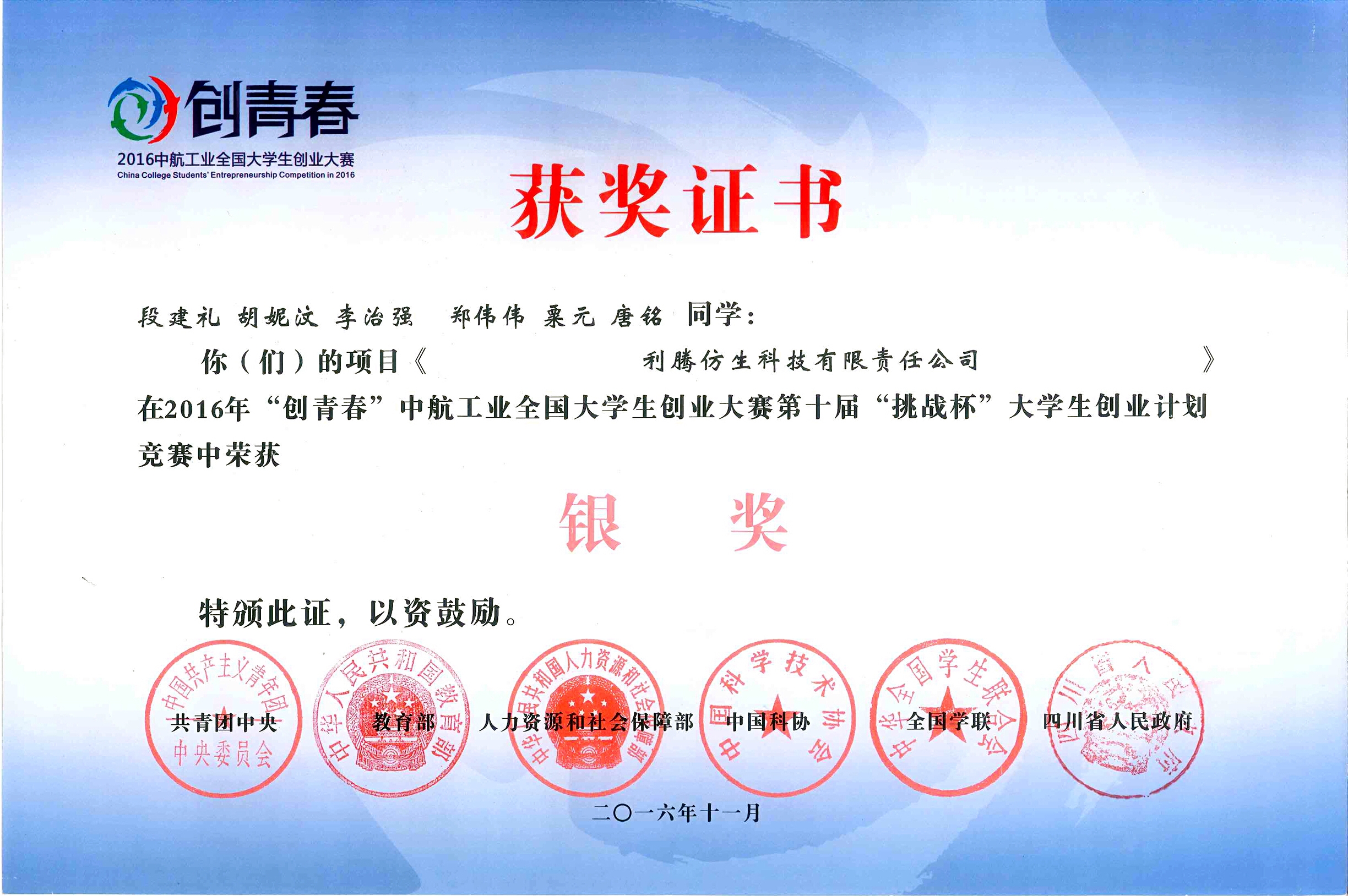 2016年11月,2016年“创青春”全国大学生创业大赛在电子科技大学圆满闭幕,现代农业与生命工程学院学生创业计划团队“利腾仿生科技有限责任公司” (作者:段建礼、胡妮汶、李治强、郑伟伟、粟元、唐铭;指导老师:张敏、孙钟雷)经过激烈的网络评审、现场答辩,最终荣获全国银奖。