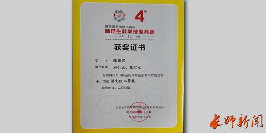 2016年12月2至3日,第四届全国高校师范生教学技能竞赛在浙江师范大学举办。我校文学院学子陈丽君代表我校参加语文组比赛,经过激烈角逐,最终获得二等奖。
