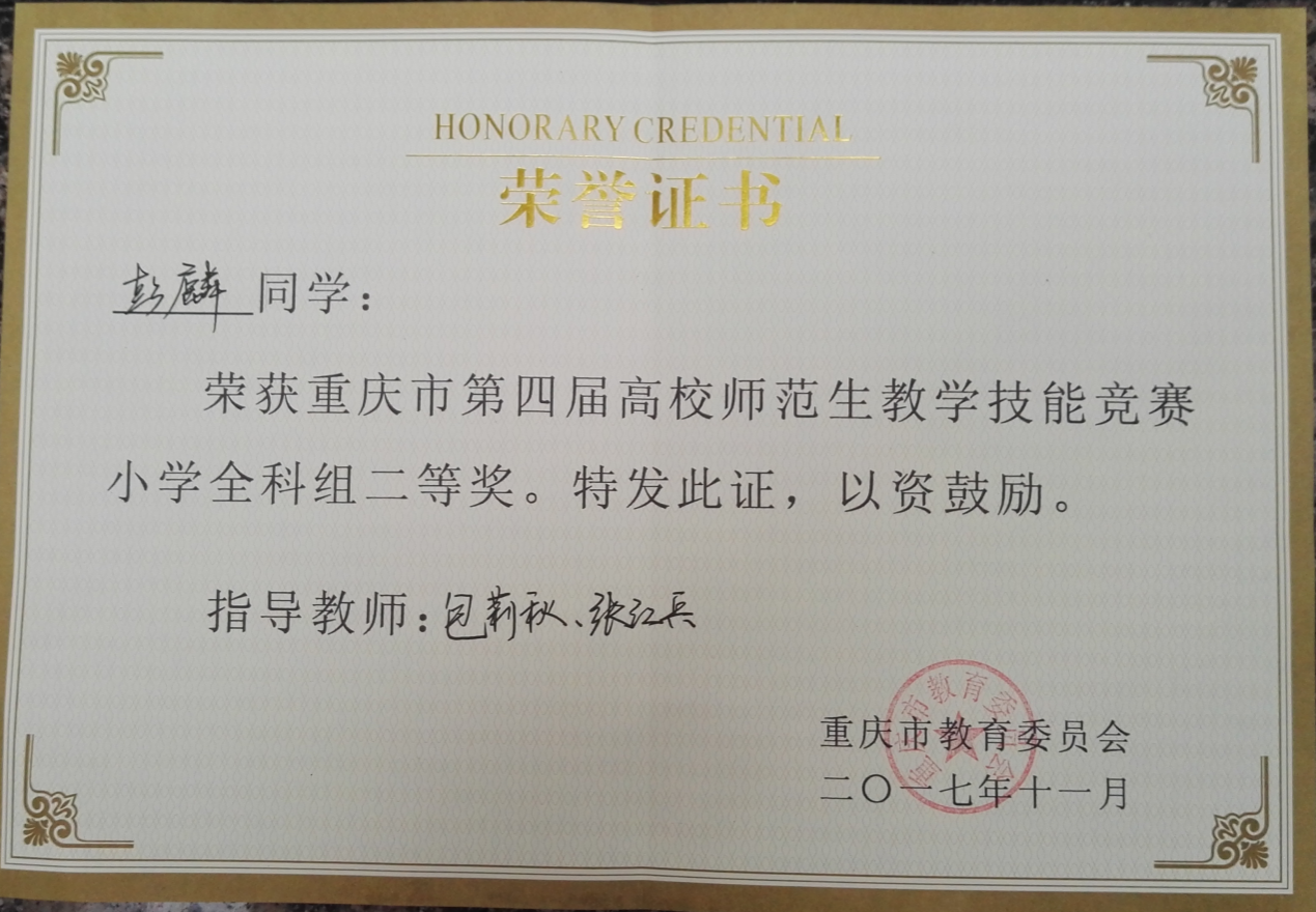 2017年11月,重庆市第四届高校师范生教学技能竞赛在重庆第二师范学院南山校区举行,全市10所院校的112名选手参加了比赛。文学院汉语言文学专业2014级黄晶同学以排名第一获语文组一等奖,小学教育专业选手彭麟同学以排名第三获二等奖。