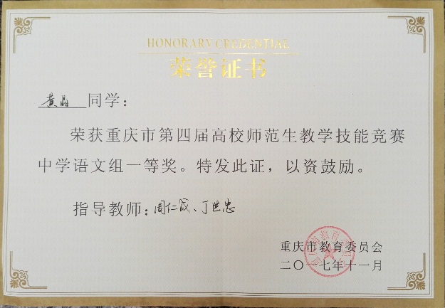 重庆市第三届高校师范生教学技能竞赛获一等奖