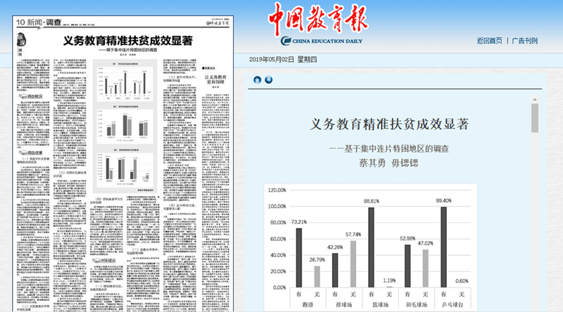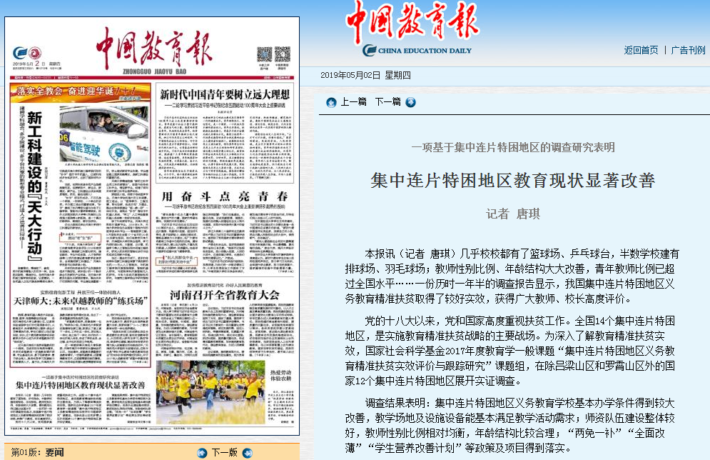 5月2日,《中国教育报》在新闻•调查版刊发署名文章,并在头版做阅读推荐,报道我校教育学“集中连片特困地区义务教育精准扶贫实效评价与跟踪研究”课题组的调查研究成果。现将文章转发于此,供大家阅读。
