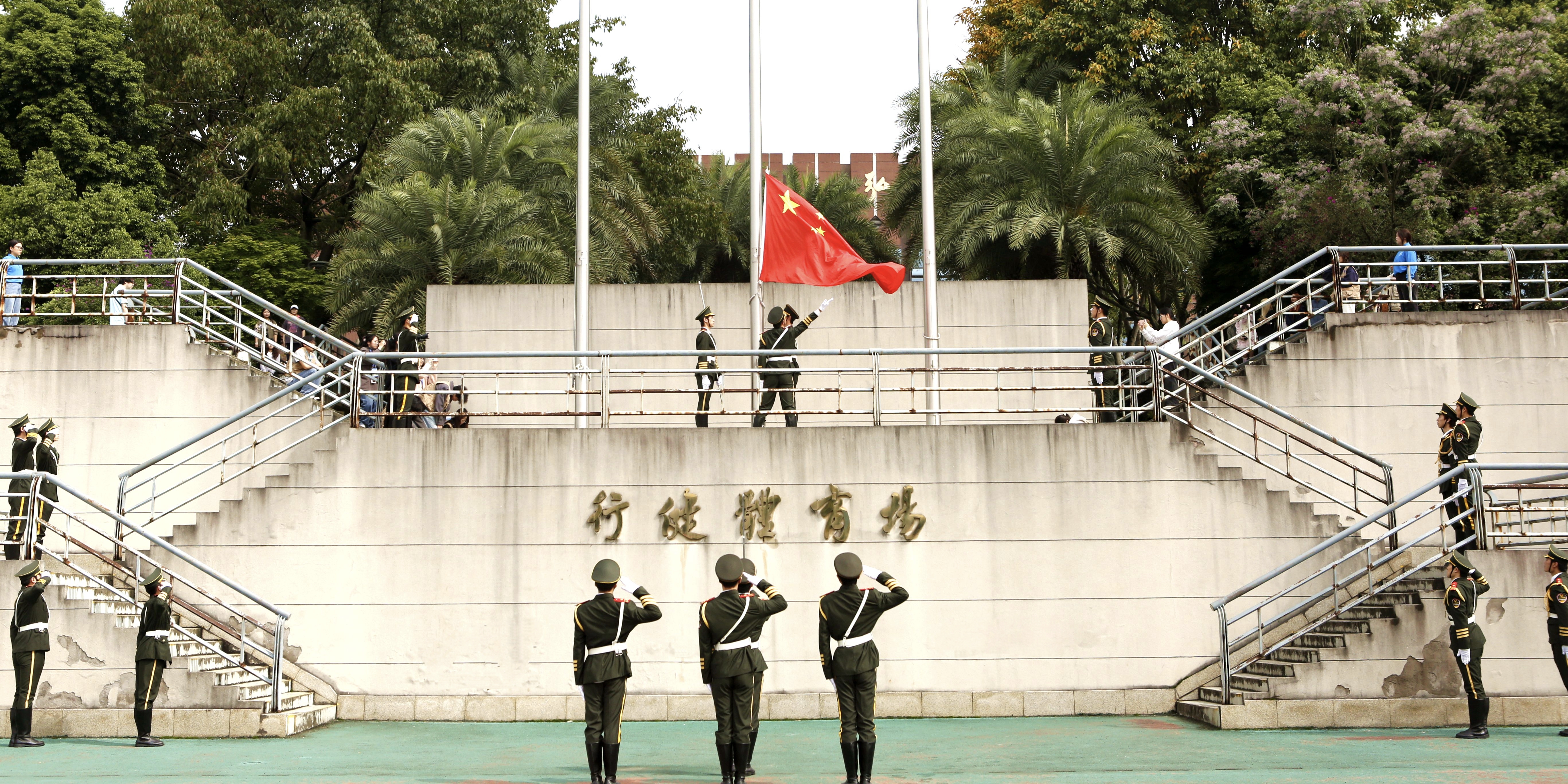 入场仪式后,国旗护卫队迈着铿锵步伐护送国旗入场。全体师生肃立注目,高唱《中华人民共和国国歌》,鲜艳的五星红旗在晨光中冉冉升起。庄严的升旗仪式厚植家国情怀,凝聚奋进力量,展现出全校师生昂扬向上、同心向党精神风貌。
